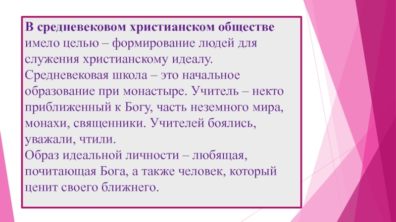 Слайд 13В средневековом христианском обществе имело целью – формирование людей для служения