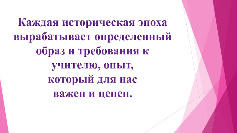 Слайд 30Каждая историческая эпоха вырабатывает определенный образ и требования к учителю, опыт,