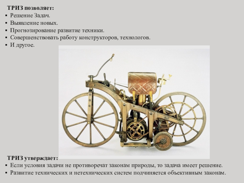 ТРИЗ – является развитие творческих способностей; активизация творческого мышления для продуктивной познавательной, исследовательской и изобретательской деятельности; формирование качеств творческой личности.
