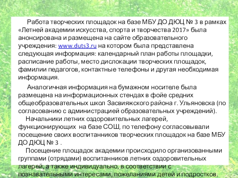 в рамках «Летней академии искусства, спорта и творчества 2017» была анонсирована и размещена на сайте образовательного учреждения: www.duts3.ru на котором была представлена следующая информация: календарный план работы площадки, расписание работы, место дислокации творческих площадок, фамилии педагогов, контактные телефоны и другая необходимая информация.