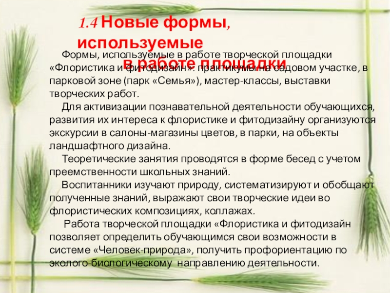 Формы, используемые в работе творческой площадки «Флористика и фитодизайн»: практикумы на садовом участке, в парковой зоне (парк «Семья»), мастер-классы, выставки творческих работ.