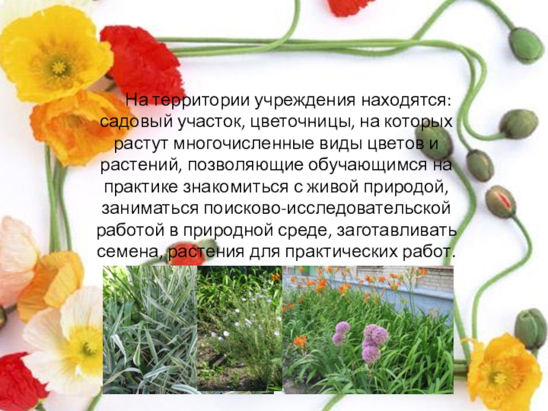 растут многочисленные виды цветов и растений, позволяющие обучающимся на практике знакомиться с живой природой, заниматься поисково-исследовательской работой в природной среде, заготавливать семена, растения для практических работ.