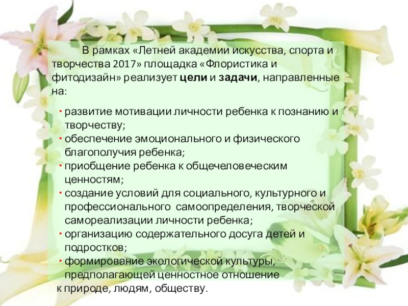 спорта и творчества 2017» площадка «Флористика и фитодизайн» реализует цели и задачи, направленные на:
