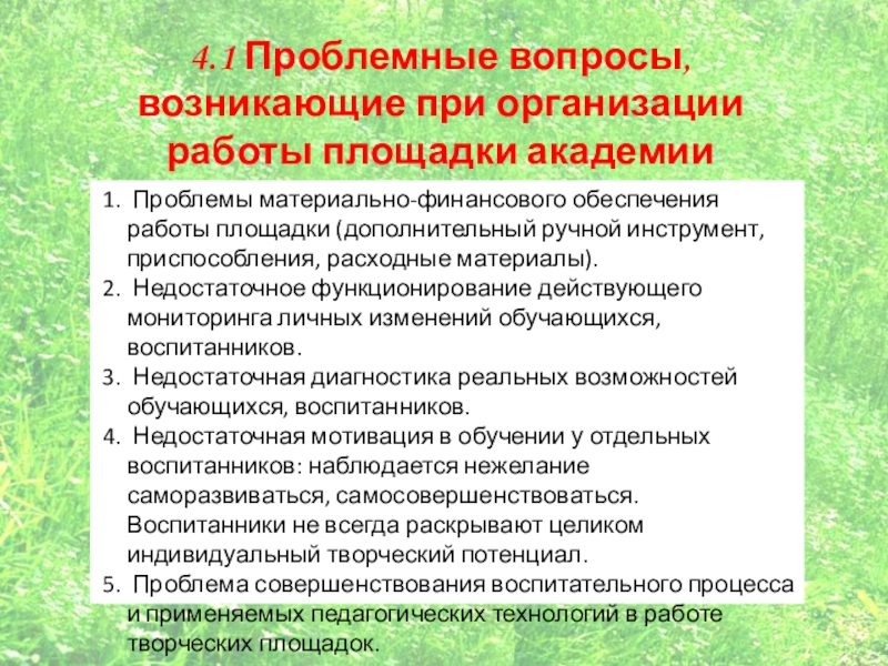 Слайд 254.1 Проблемные вопросы, возникающие при организации работы площадки академии