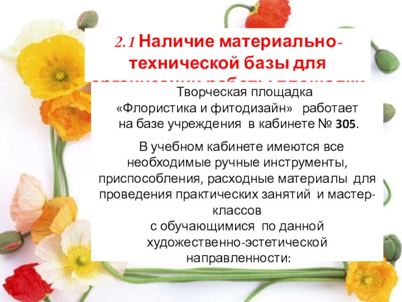 Слайд 7 Площадка «Флористика и фитодизайн» организует свою деятельность