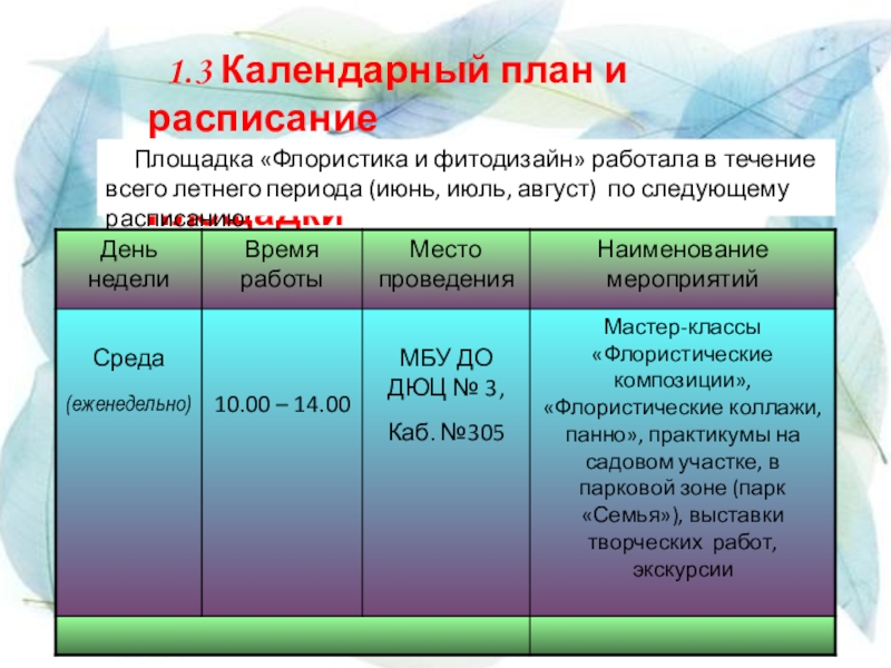 Слайд 10 1.3 Календарный план и расписание
