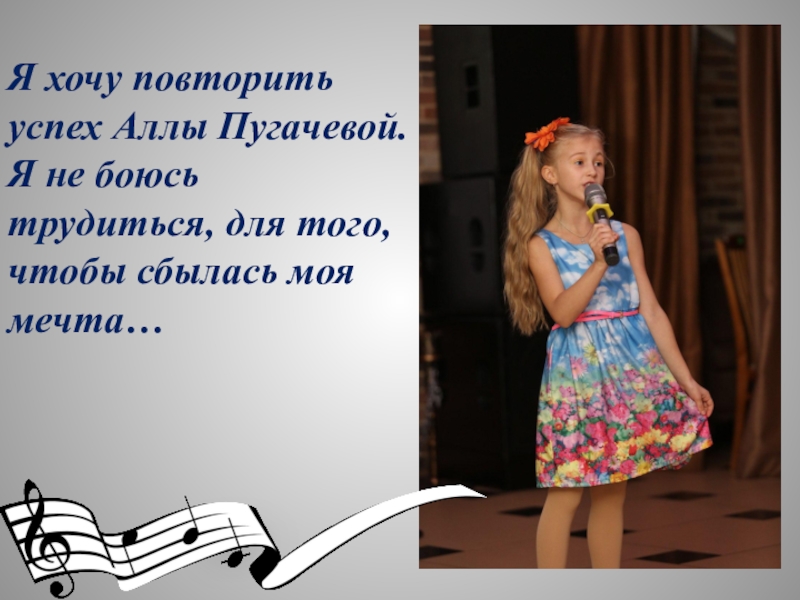 Я хочу повторить успех Аллы Пугачевой. Я не боюсь трудиться, для того, чтобы сбылась моя мечта…
