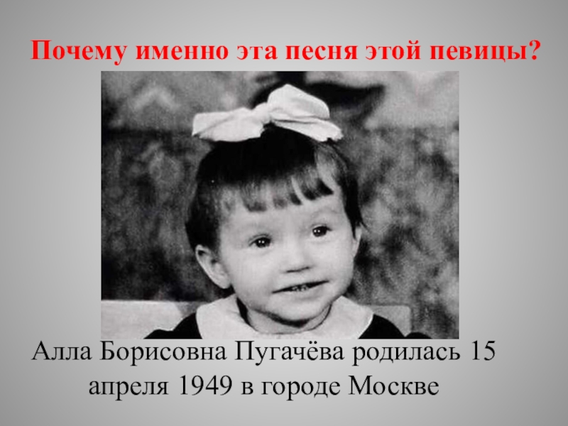 Почему именно эта песня этой певицы?Алла Борисовна Пугачёва родилась 15 апреля 1949 в городе Москве