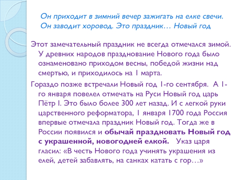 Гораздо позже встречали Новый год 1-го сентября. А 1-го января повелел отмечать на Руси Новый год царь Пётр I. Это было более 300 лет назад. И с легкой руки царственного реформатора, 1 января 1700 года Россия впервые отмечала праздник Новый год. Тогда же в России появился и обычай праздновать Новый год с украшенной, новогодней елкой. Указ царя гласил: «В честь Нового года учинять украшения из елей, детей забавлять, на санках катать с гор…»
