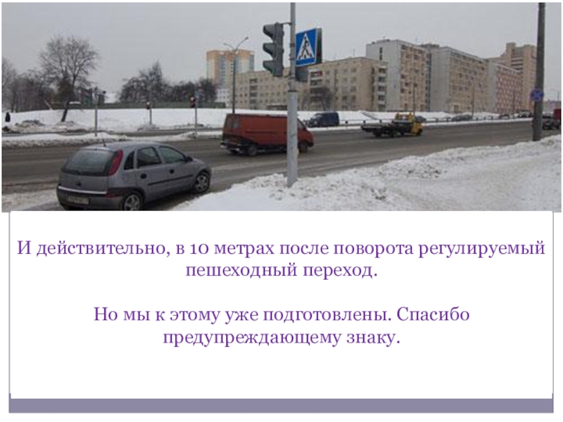 И действительно, в 10 метрах после поворота регулируемый пешеходный переход.