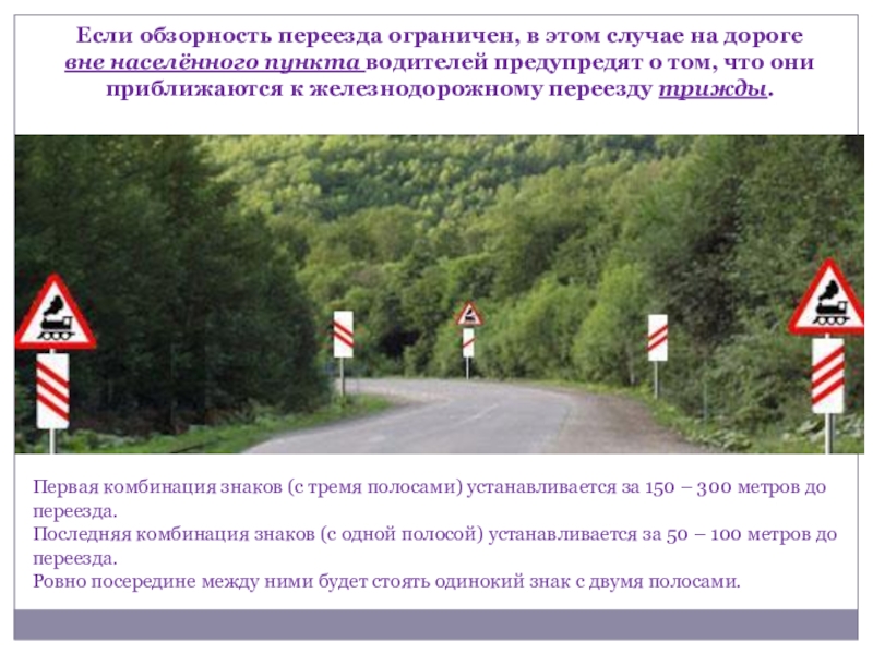 Первая комбинация знаков (с тремя полосами) устанавливается за 150 – 300 метров до переезда.