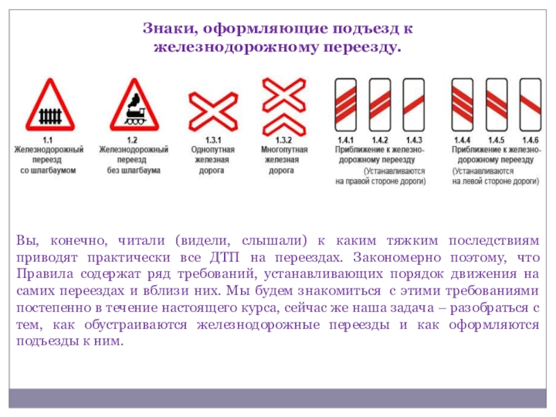 каким тяжким последствиям приводят практически все ДТП на переездах. Закономерно поэтому, что Правила содержат ряд требований, устанавливающих порядок движения на самих переездах и вблизи них. Мы будем знакомиться с этими требованиями постепенно в течение настоящего курса, сейчас же наша задача – разобраться с тем, как обустраиваются железнодорожные переезды и как оформляются подъезды к ним.