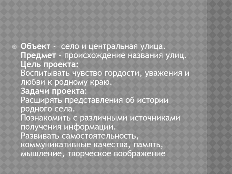 Слайд 4Объект - село и центральная улица.  Предмет – происхождение названия улиц.  Цель проекта: Воспитывать