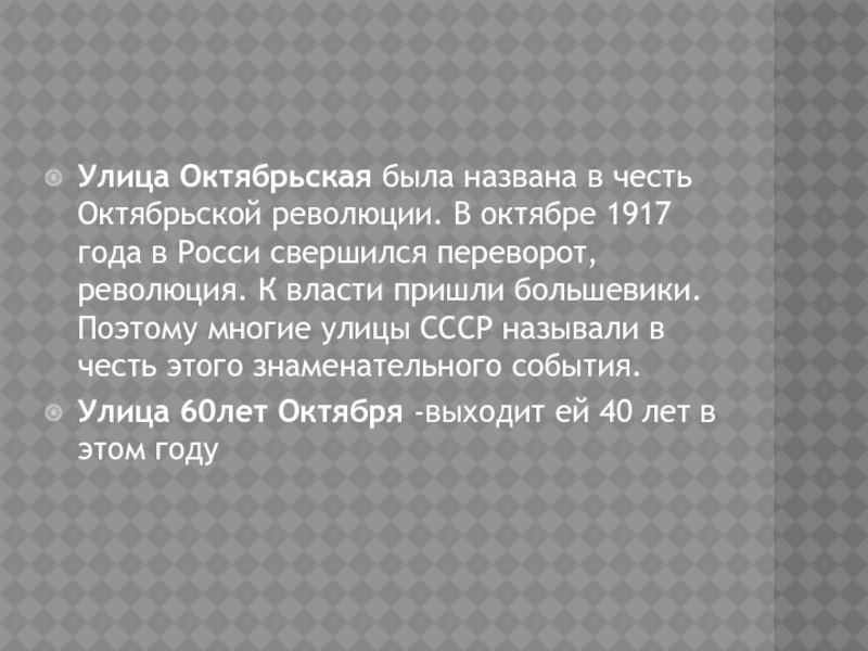 Слайд 9Улица Октябрьская была названа в честь Октябрьской революции. В октябре 1917