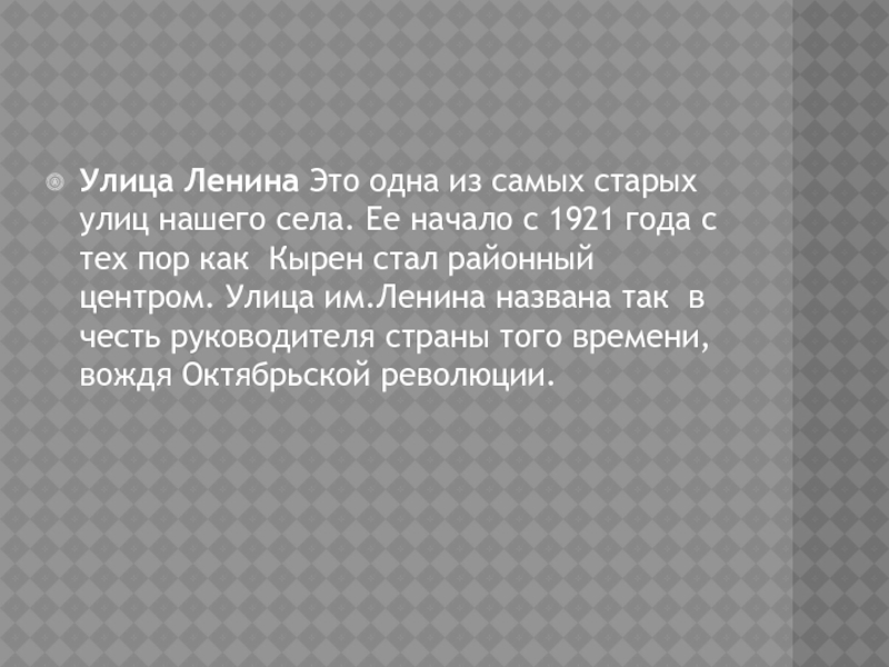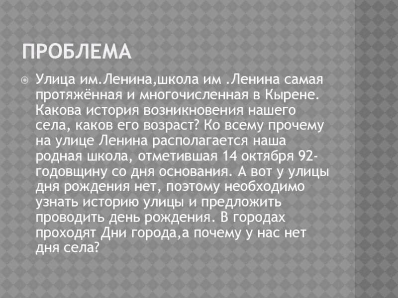 ПроблемаУлица им.Ленина,школа им .Ленина самая протяжённая и многочисленная в Кырене. Какова история возникновения нашего села, каков его возраст? Ко всему прочему на улице Ленина располагается наша родная школа, отметившая 14 октября 92-годовщину со дня основания. А