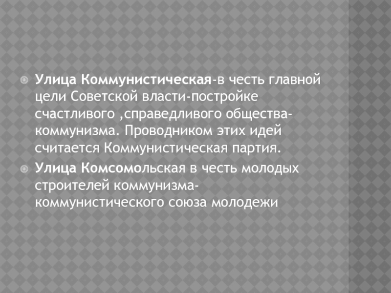 Слайд 10Улица Коммунистическая-в честь главной цели Советской власти-постройке счастливого ,справедливого общества-коммунизма. Проводником
