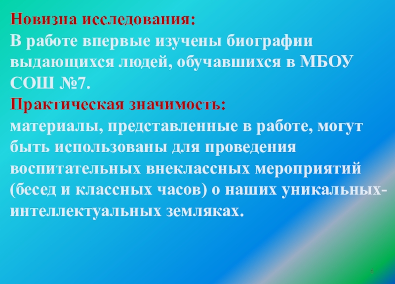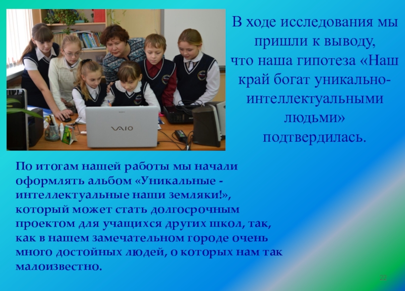 По итогам нашей работы мы начали оформлять альбом «Уникальные - интеллектуальные наши земляки!», который может стать долгосрочным проектом для учащихся других школ, так, как в нашем замечательном городе очень много достойных людей, о которых нам так малоизвестно.