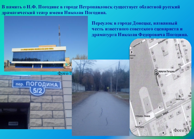 Переулок в городе Донецке, названный честь известного советского сценариста и драматурга Николая Федоровича Погодина.