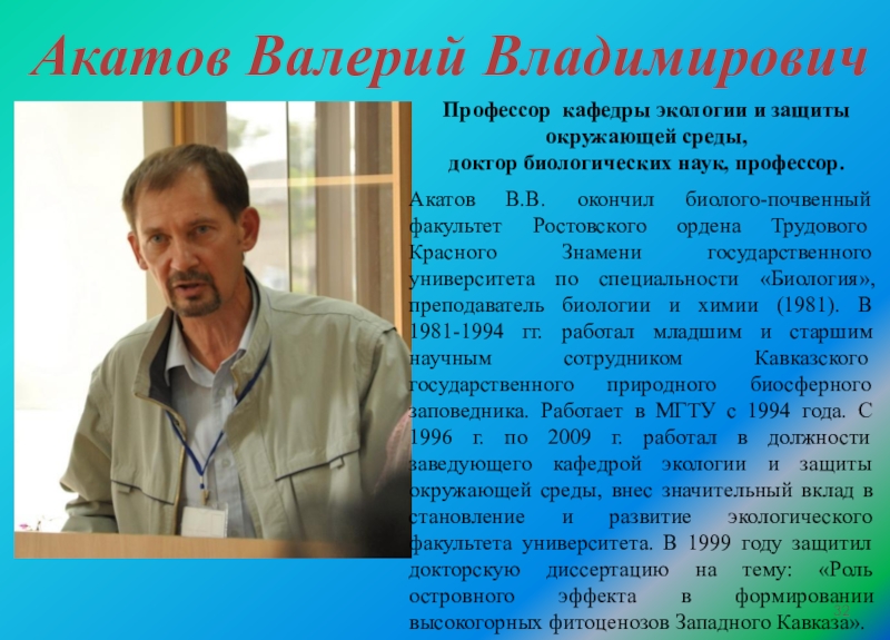 Акатов В.В. окончил биолого-почвенный факультет Ростовского ордена Трудового Красного Знамени государственного университета по специальности «Биология», преподаватель биологии и химии (1981). В 1981-1994 гг. работал младшим и старшим научным сотрудником Кавказского государственного природного биосферного заповедника. Работает в МГТУ с 1994 года. С 1996 г. по 2009 г. работал в должности заведующего кафедрой экологии и защиты окружающей среды, внес значительный вклад в становление и развитие экологического факультета университета. В 1999 году защитил докторскую диссертацию на тему: «Роль островного эффекта в формировании высокогорных фитоценозов Западного Кавказа».