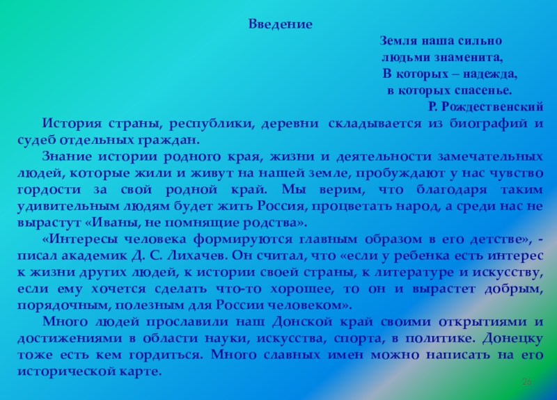 люди (земляки), их личный пример, вклад в развитие современного общества.