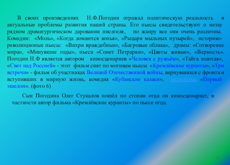 Сын Погодина Олег Стукалов пошёл по стопам отца он киносценарист, в частности автор фильма «Кремлёвские куранты» по пьесе отца.