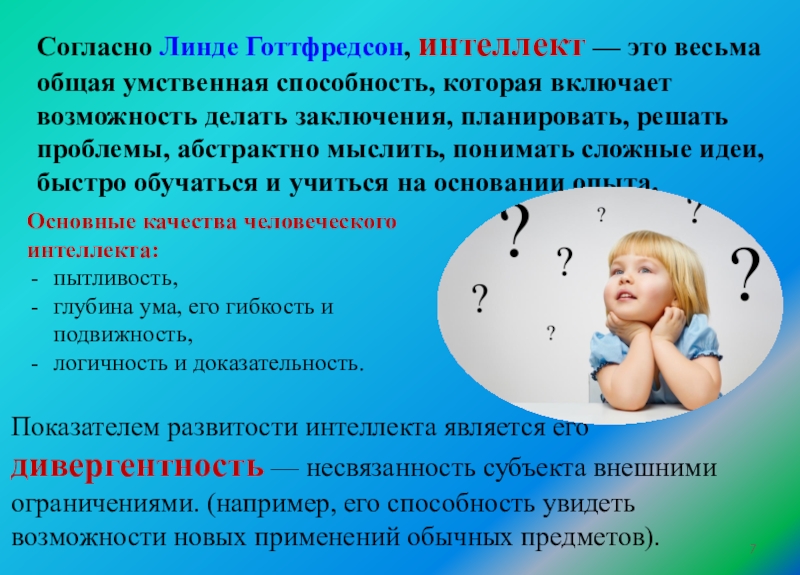 Показателем развитости интеллекта является его дивергентность — несвязанность субъекта внешними ограничениями. (например, его способность увидеть возможности новых применений обычных предметов).
