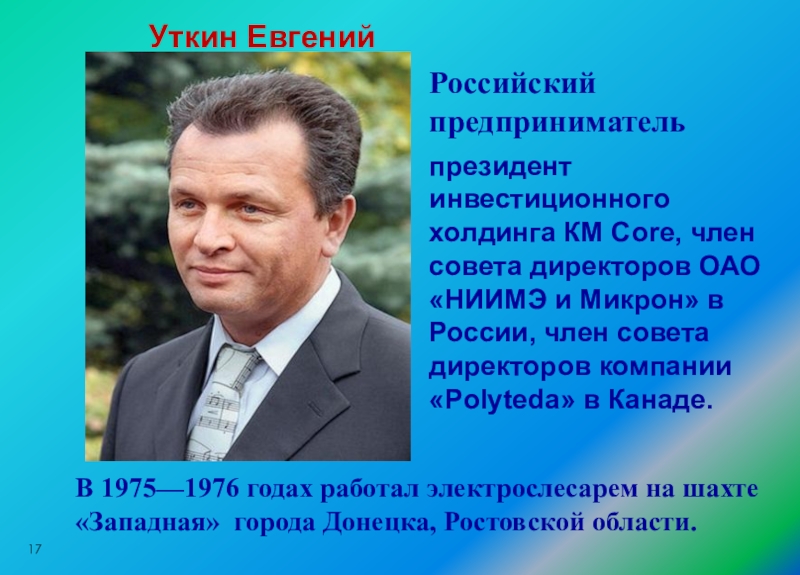 президент инвестиционного холдинга КМ Core, член совета директоров ОАО «НИИМЭ и Микрон» в России, член совета директоров компании «Polyteda» в Канаде.