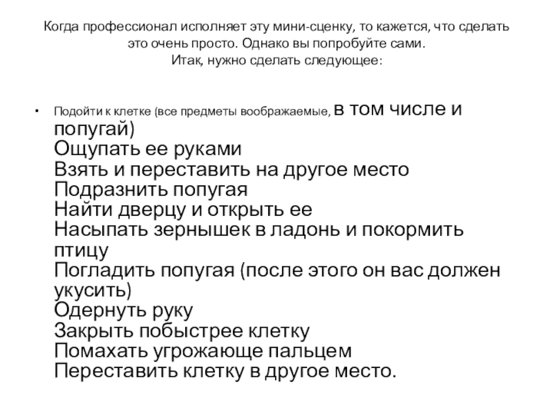 Подойти к клетке (все предметы воображаемые, в том числе и попугай)