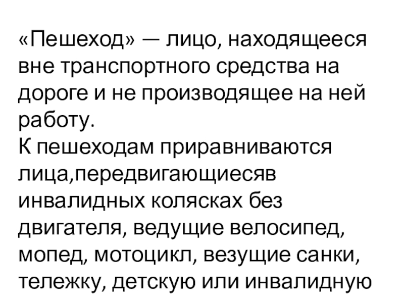 К пешеходам приравниваются лица,передвигающиесяв инвалидных колясках без двигателя, ведущие велосипед, мопед, мотоцикл, везущие санки, тележку, детскую или инвалидную коляску.