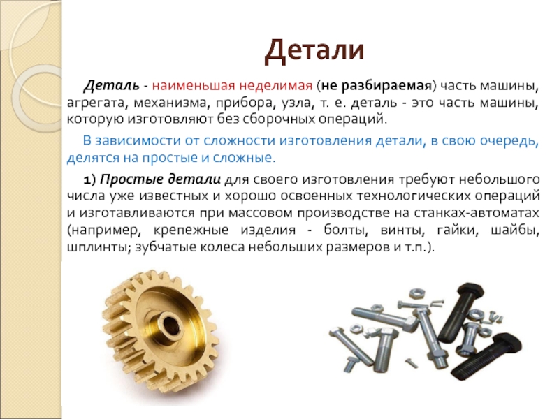 1) Простые детали для своего изготовления требуют небольшого числа уже известных и хорошо освоенных технологических операций и изготавливаются при массовом производстве на станках-автоматах (например, крепежные изделия - болты, винты, гайки, шайбы, шплинты; зубчатые колеса небольших размеров и т.п.).
