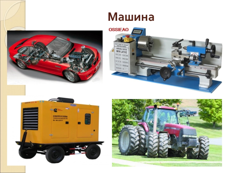 - машины-орудия, производящие работу, связанную с транспортировкой или с изменением формы и размеров тел, например конвейеры, станки, трактора, автомобили.