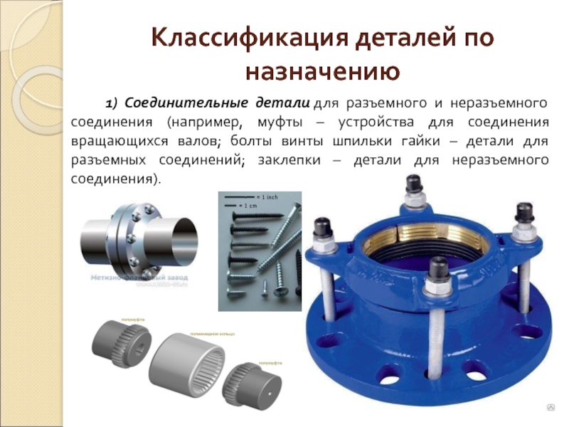 неразъемного соединения (например, муфты – устройства для соединения вращающихся валов; болты винты шпильки гайки – детали для разъемных соединений; заклепки – детали для неразъемного соединения).