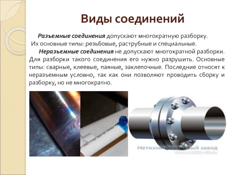 Неразъемные соединения не допускают многократной разборки. Для разборки такого соединения его нужно разрушить. Основные типы: сварные, клеевые, паяные, заклепочные. Последние относят к неразъемным условно, так как они позволяют проводить сборку и разборку, но не многократно.