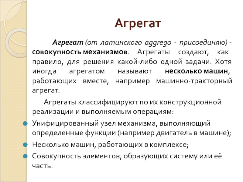 Агрегат (от латинского aggrego - присоединяю) - совокупность механизмов.