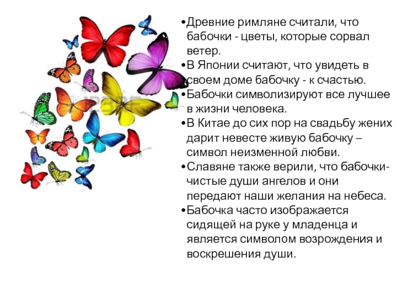 Древние римляне считали, что бабочки - цветы, которые сорвал ветер.В Японии считают, что увидеть в своем доме