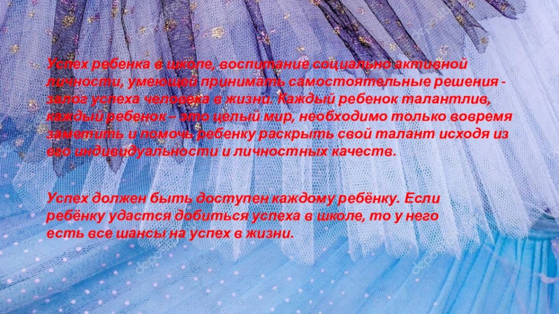 Успех должен быть доступен каждому ребёнку. Если ребёнку удастся добиться успеха в школе, то у него есть все шансы на успех в жизни.