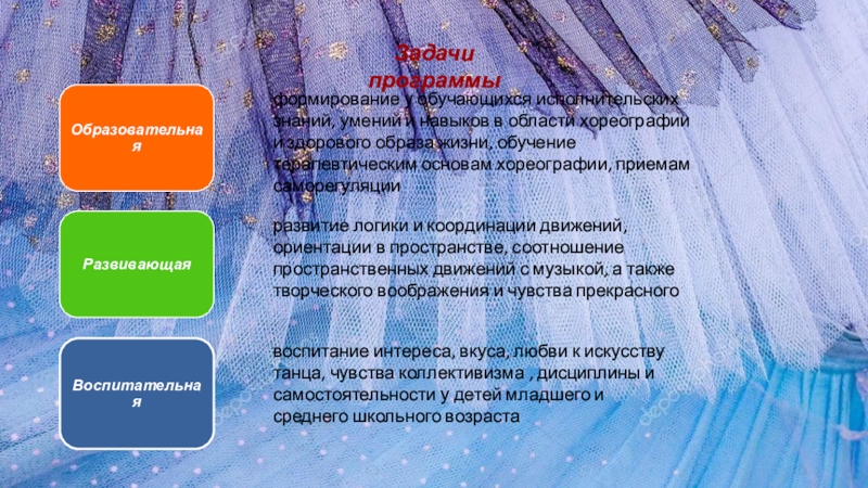 развитие логики и координации движений, ориентации в пространстве, соотношение пространственных движений с музыкой, а также творческого воображения и чувства прекрасного