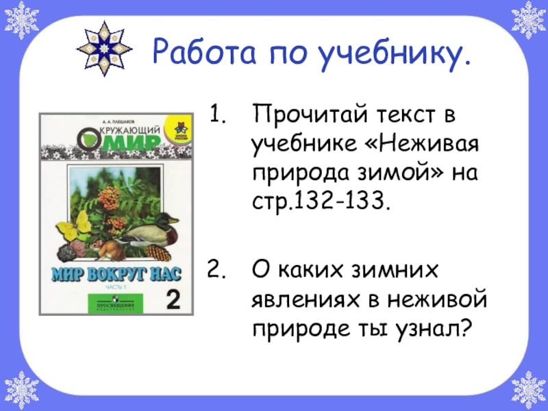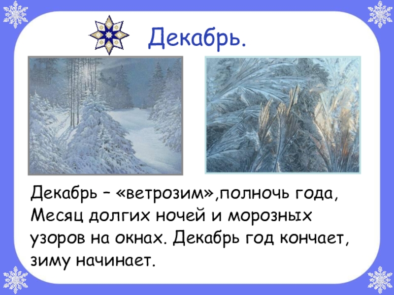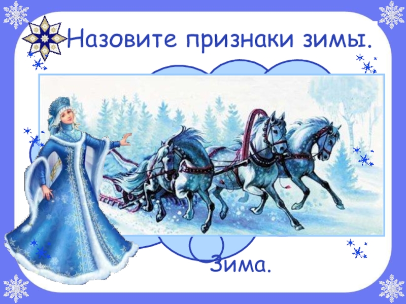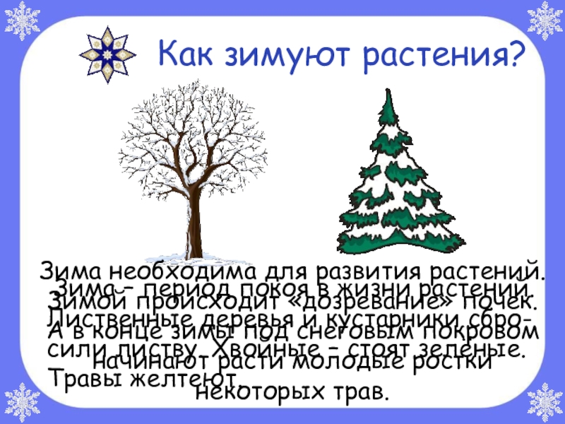 Зима – период покоя в жизни растений. Лиственные деревья и кустарники сбро-сили листву. Хвойные – стоят зелёные. Травы желтеют.