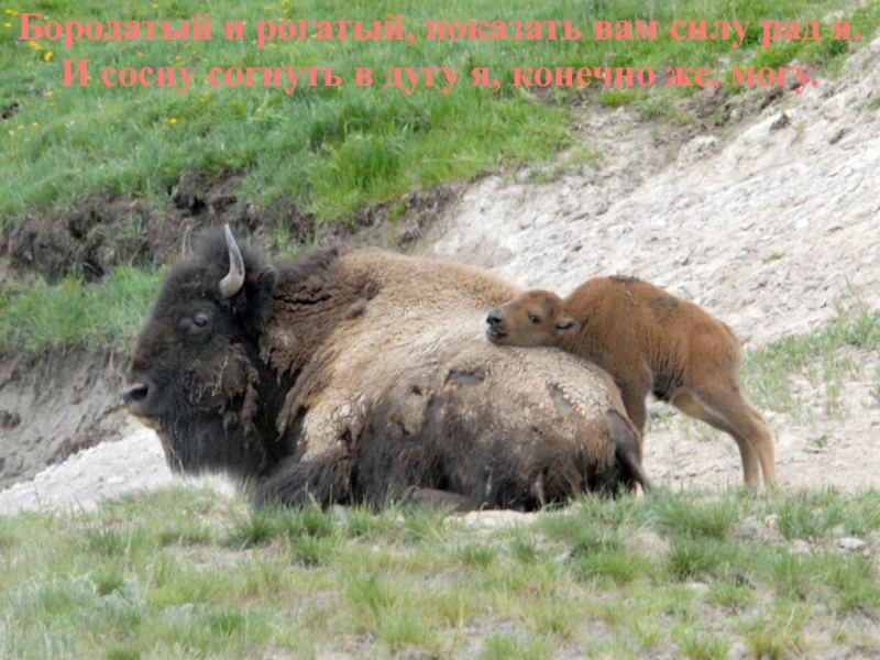 Слайд 5Бородатый и рогатый, показать вам силу рад я. И сосну согнуть в