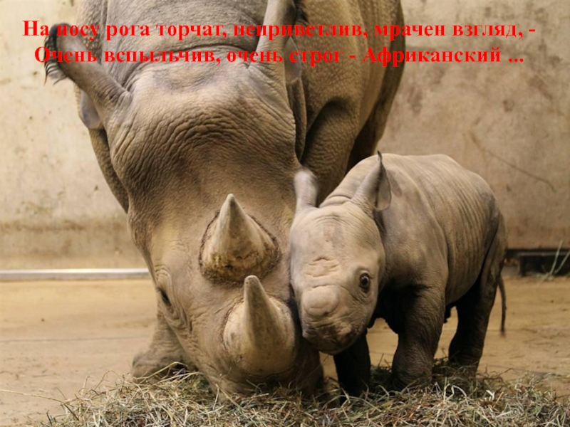 Слайд 9На носу рога торчат, неприветлив, мрачен взгляд, -  Очень вспыльчив, очень строг - Африканский