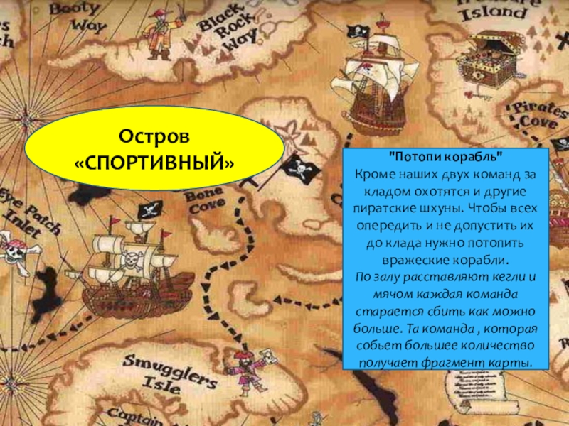 По залу расставляют кегли и мячом каждая команда старается сбить как можно больше. Та команда , которая собьет большее количество получает фрагмент карты.