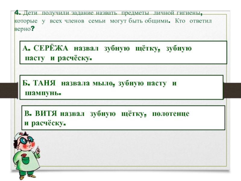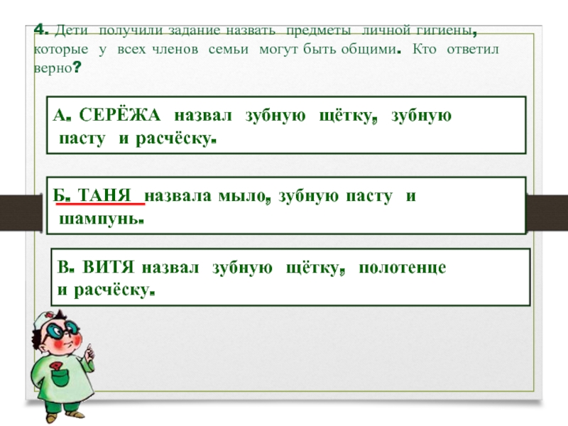 Б. ТАНЯ назвала мыло, зубную пасту и