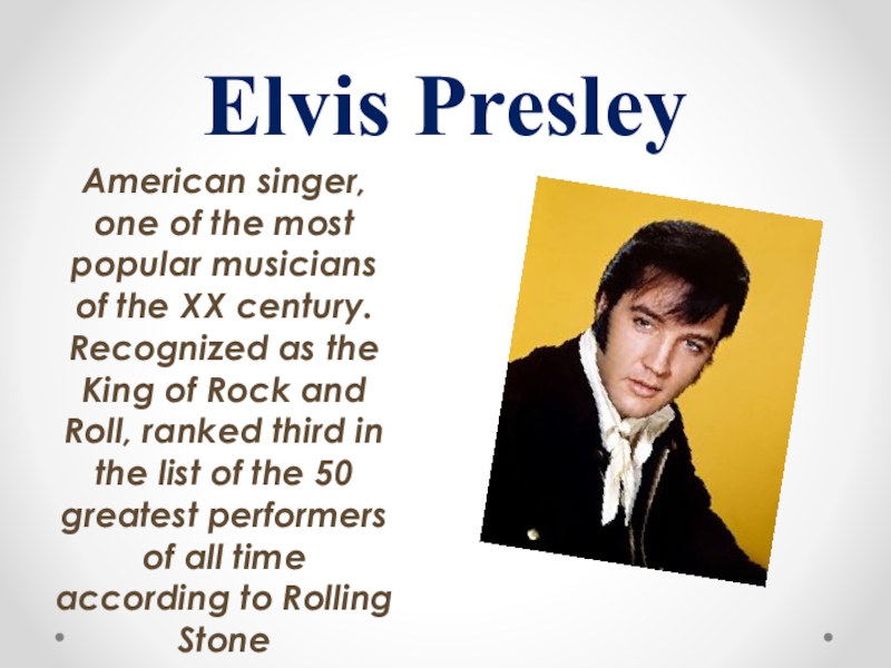 Elvis PresleyAmerican singer, one of the most popular musicians of the XX century. Recognized as the King