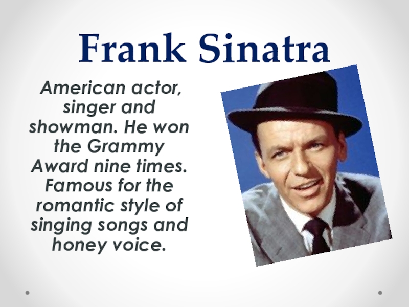 Frank Sinatra American actor, singer and showman. He won the Grammy Award nine times. Famous for the romantic