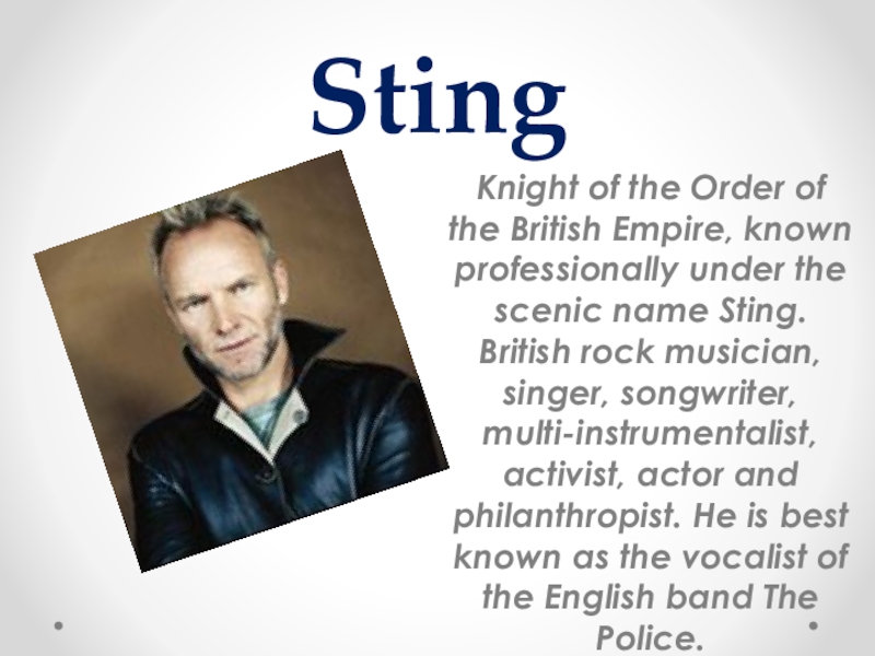 the scenic name Sting. British rock musician, singer, songwriter, multi-instrumentalist, activist, actor and philanthropist. He is best known as the vocalist of the English band The Police.