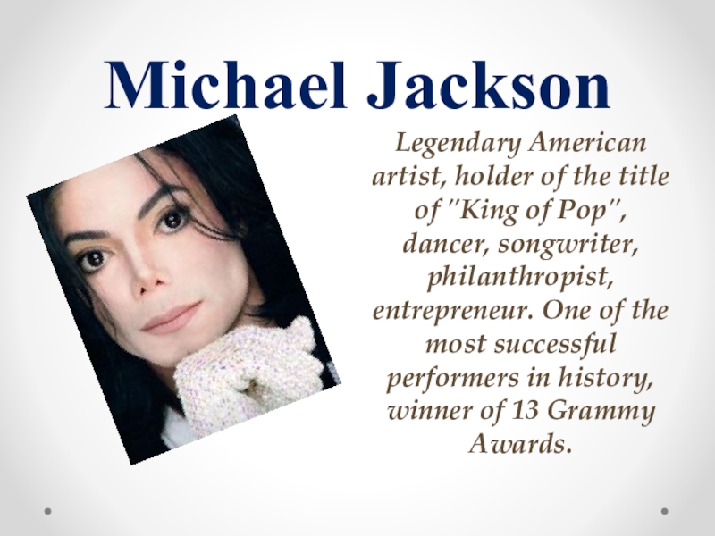 Michael JacksonLegendary American artist, holder of the title of "King of Pop", dancer, songwriter, philanthropist, entrepreneur. One of the most successful performers in history, winner of 13 Grammy Awards.