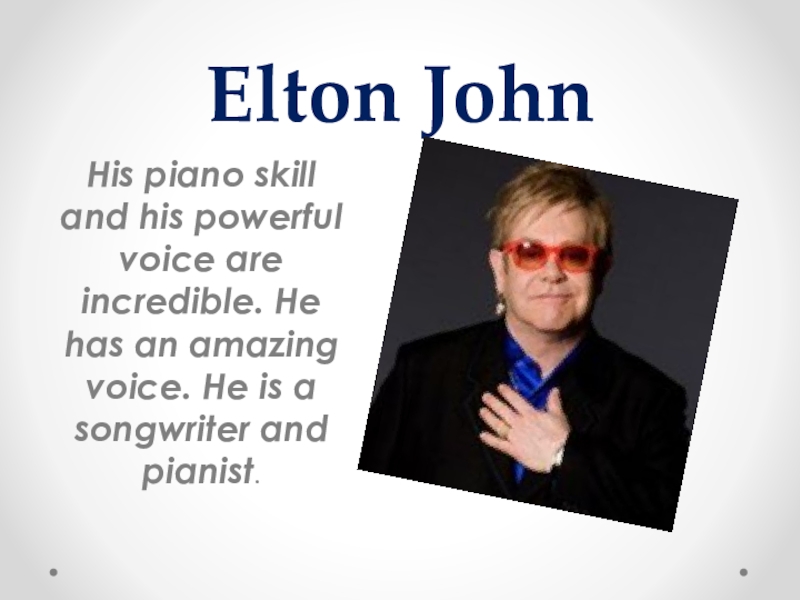 Elton JohnHis piano skill and his powerful voice are incredible. He has an amazing voice. He is