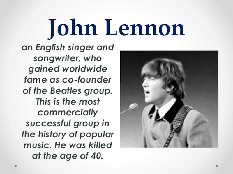 co-founder of the Beatles group. This is the most commercially successful group in the history of popular music. He was killed at the age of 40.
