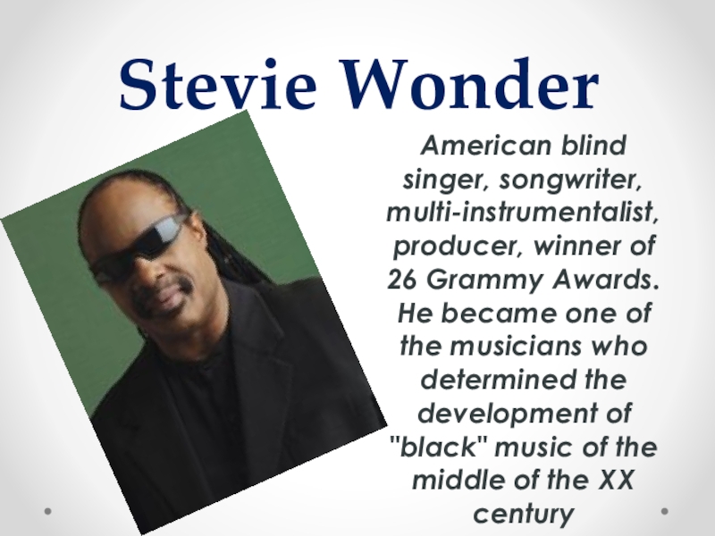 Stevie WonderAmerican blind singer, songwriter, multi-instrumentalist, producer, winner of 26 Grammy Awards. He became one of the