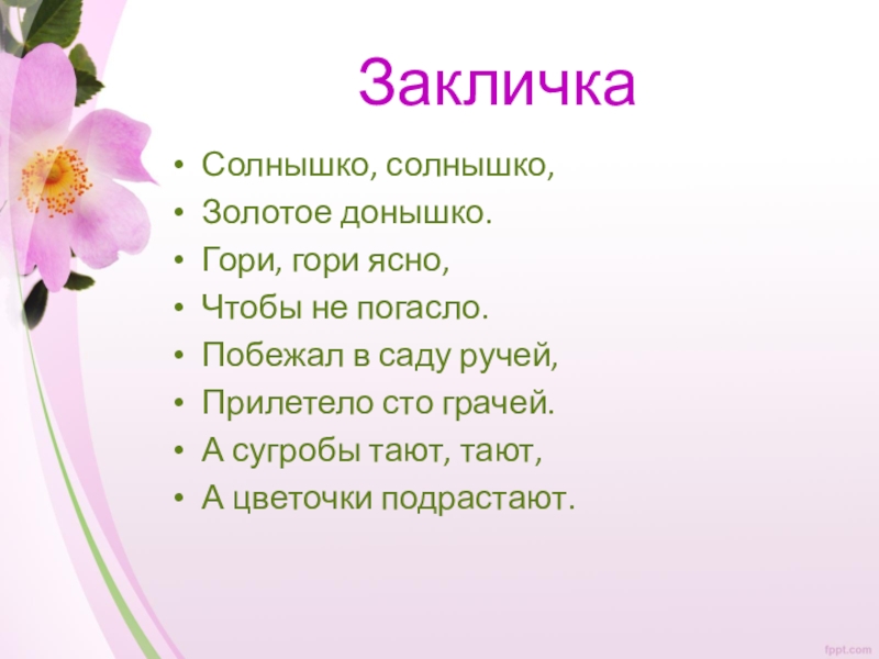 Закличка Солнышко, солнышко,Золотое донышко.Гори, гори ясно,Чтобы не погасло.Побежал в саду ручей,Прилетело сто грачей.А сугробы тают, тают,А цветочки